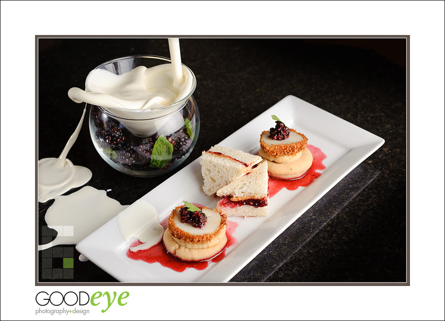 In my last post, I showed some select shots from the first shoot with Matt Mermod, the Executive Chef at soon-to-be-open Kaama Lounge in San Jose. We were experimenting with high-speed (1/800 sec) food photography, which is fun, but a little stressful for the photographer (aka me) as I really only had one chance to get the shot, as whatever we were pouring inevitably ruined the dish. But anyone who knows me understands I crave the challenge and love to try new techniques and creative ideas. Well the first shoot was such a smashing success (according to all involved) we immediately got back into it for some more dishes. There’s really only one “money”action shot (above), and I’ve decided this is a special niche of photography I’ll call “food porn.” If you can’t figure it out, well, ask a friend.